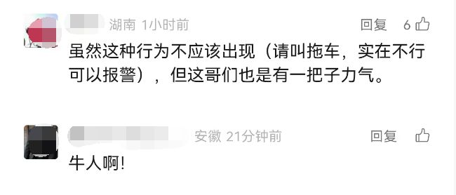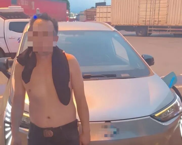 此时的刘某,光着膀子,满头大汗,他说自己开的是一辆新能源汽车,结果电量不足,他只好下车推行。
