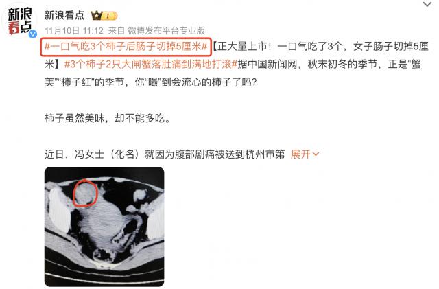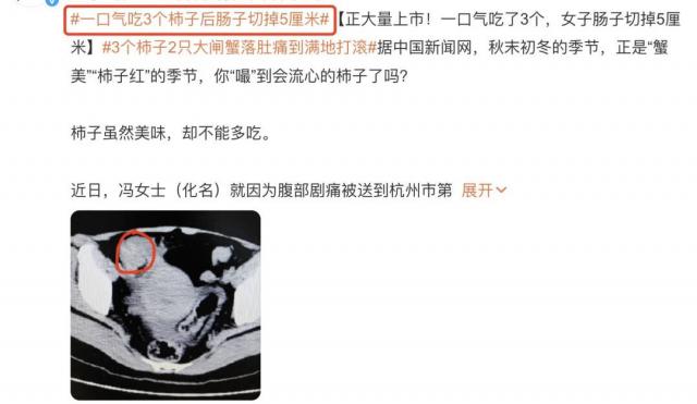 ▶之前还有,杭州市第一人民医院,有女子一口气吃了 3 个柿子,小肠发生梗阻,女子肠子被切掉 5 厘米。