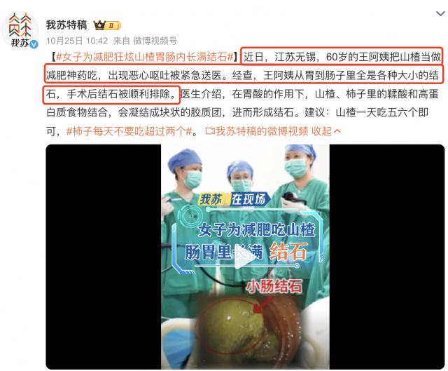 ▶ 之前,就有新闻报道,江苏 60 岁的王阿姨把山楂当做减肥神药吃,结果从胃到肠子里,全是各种大小的结石......