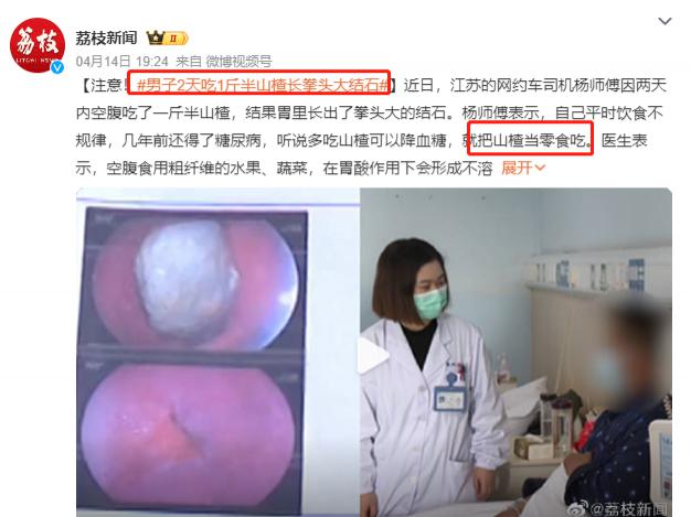 ▶ 江苏一名男子 2 天吃进 1 斤半山楂,结果胃里长出拳头大的结石,住进医院。