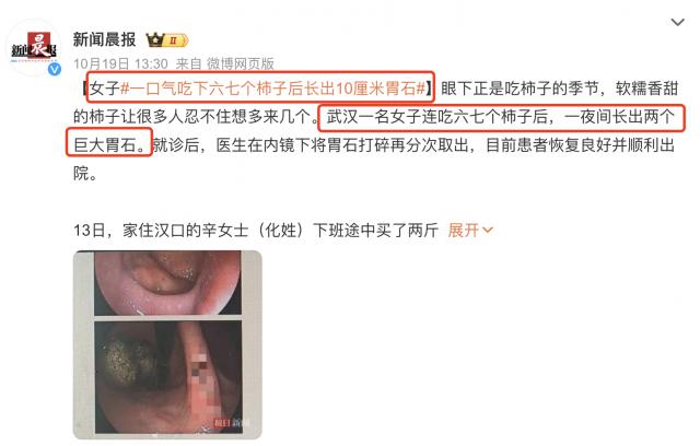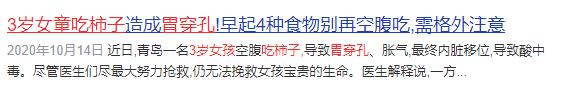 ▶ 还有新闻报道过,有 3 岁孩子空腹吃柿子,导致胃穿孔而丧命的......