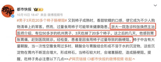 ▶ 根据都市快报报道,杭州 50 多岁男子,3 天吃掉了 20 多个柿子,这之后的几天,他感到胃胀胃痛,赶到医院就诊。经检查,患者是因食用柿子过量导致肠梗阻。