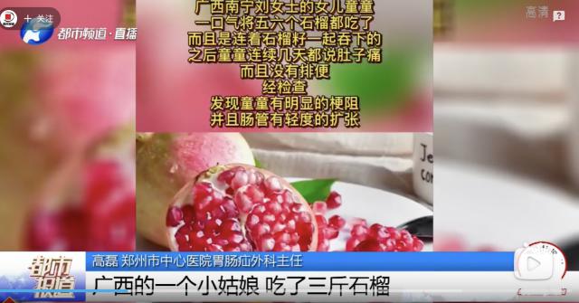 ▶ 此前就有媒体报道,广西南宁一女童,一口气吃了五六个石榴(连带石榴籽),吃完后孩子连续几天都说肚子痛,而且没有排便,家长赶紧将她送进医院。经检查发现,女童有明显的梗阻,并且肠管有轻度的扩张 ......